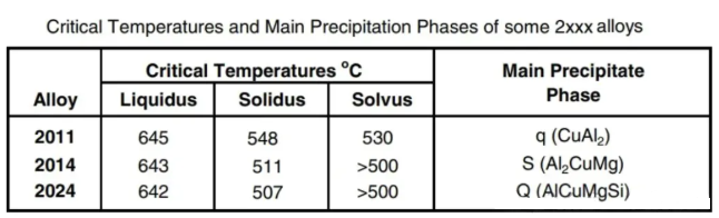 Critical temperatures and main precipitate phases of several 2xxx alloys are shown in Figure 4. Because many 2xxx alloys have a long solidification range (the difference between liquidus and solidus temperatures), solidification proceeds slowly, forming coarse dendritic structures. Microsegregation tends to be significant, and dissolution during homogenization is slow—especially under commercial conditions where temperatures cannot approach the liquidus. The long solidification range also affects the inverse segregation depth on the billet surface, often requiring longer extrusion discard lengths (up to 12%).