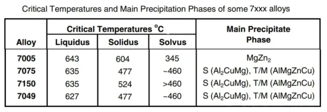 Common 7xxx alloys consist of two basic groups: medium to high-strength Al-Zn-Mg alloys and high-strength Al-Zn-Mg-Cu alloys. Their critical temperatures and major precipitation stages are shown in Figure 5. The long solidification range typical of Al-Zn-Mg-Cu alloys causes microsegregation problems similar to those found in the 2xxx series.