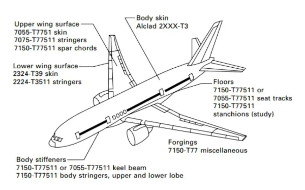 Typical major elements of 2xxx alloys are shown in Figure 1. The 2xxx series alloys include several groups. The Al-Cu group contains binary alloys (e.g., 2219 with 6% Cu). Al-Cu-Mg alloys (e.g., 2024 and 2014) are the most commonly used 2xxx series extrusions for aircraft structures. They evolved from the 2017 alloy discovered by Wilm in 1911. These alloys possess medium to high strength with good ductility and toughness. 2024 and 2014 alloys are mainly used as structural components on the lower wing surface, where tensile, fatigue, and stress corrosion conditions make many higher-strength 7xxx alloys unacceptable. Variants of these alloys, such as 2124 and 2224, offer improved properties—particularly fracture toughness—through a combination of purity control, microstructural development, and temper optimization.