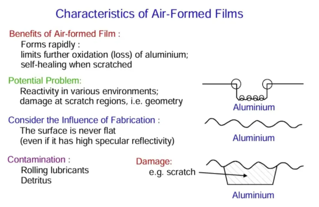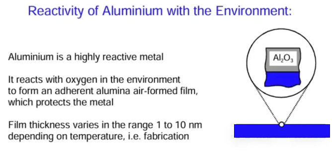 The effective use of aluminum is highly sensitive to its potential reactivity under various environmental conditions. Fortunately, in many cases, exposure of aluminum results in the rapid formation of an air-formed aluminum oxide film.
