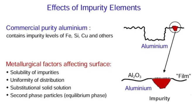 ·The solubility of iron in aluminum is very low. Therefore, in commercially pure materials, iron exists as a relatively coarse second-phase material.