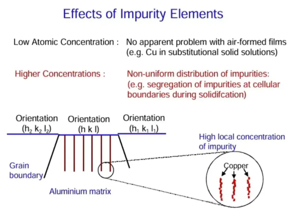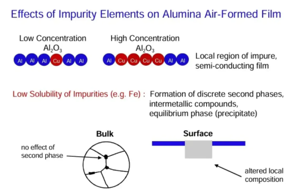 ·Common impurity elements in alloyed aluminum include copper, silicon, and iron.