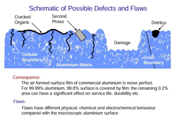 The gas-formed film on the aluminum surface contains various defects, generally referred to as flaws. Although the total area occupied by these defects is small, their formation process largely determines aluminum’s effective behavior.