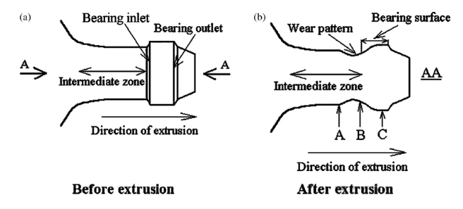 • The wear mechanism for Inconel 718 aluminum extrusion dies is similar to that for steel dies. Maximum material damage occurred in the middle of the contact interface, while the area in front of the middle section and the area near the bearing exit experienced minor wear and no wear, respectively.